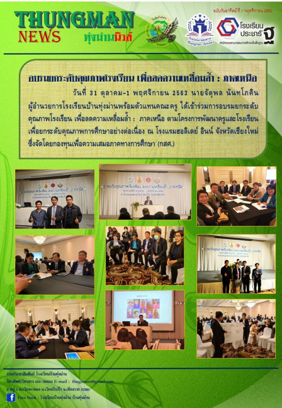 วันที่ 31 ตุลาคม–1 พฤศจิกายน 2563 นายจัตุพล นันทโภคินผู้อำนวยการโรงเรียนบ้านทุ่งม่านพร้อมตัวแทนคณะครู ได้เข้าร่วมการอบรมยกระดับคุณภาพโรงเรียน เพื่อลดความเหลื่อมล้ำ : ภาคเหนือ ตามโครงการพัฒนาครูและโรงเรียน เพื่อยกระดับคุณภาพการศึกษาอย่างต่อเนื่อง ณ โรงแรมฮอลิเดย์ อินน์ จังหวัดเชียงใหม่ ซึ่งจัดโดยกองทุนเพื่อความเสมอภาคทางการศึกษา (กสศ.)