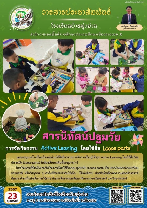 แผนกอนุบาลโรงเรียนบ้านทุ่งม่านได้จัดกิจกรรมการจัดการเรียนรู้เชิงรุก Active Learning โดยใช้สื่อวัสดุปลายเปิด (Loose parts) ในห้องเรียนระดับชั้นอนุบาล 1-2