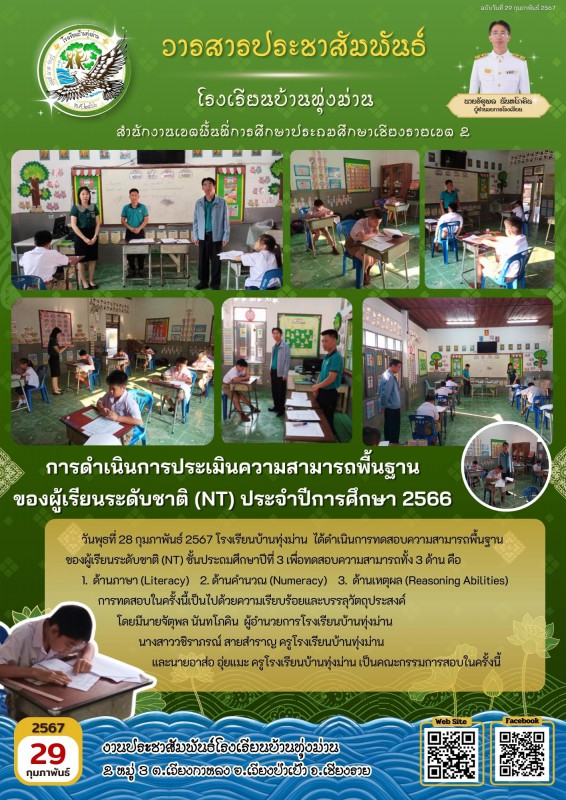 วันพุธที่ 28 กุมภาพันธ์ 2567 โรงเรียนบ้านทุ่งม่าน ได้ดำเนินการทดสอบความสามารถพื้นฐานของผู้เรียนระดับชาติ (NT) ชั้นประถมศึกษาปีที่ 3 เพื่อทดสอบความสามารถทั้ง 3 ด้าน คือ